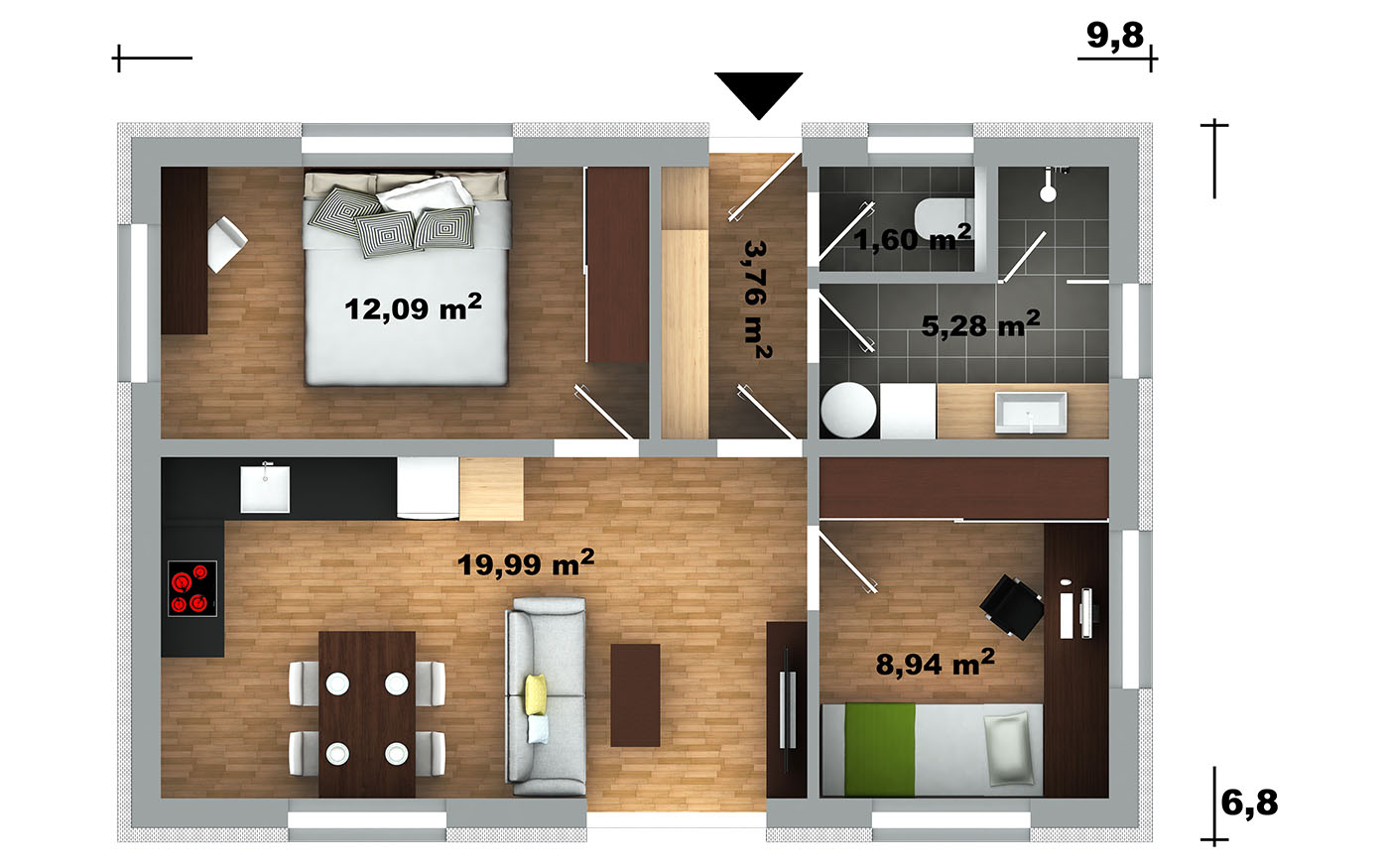 Jest to bardzo korzystny ekonomicznie dom 3+kk o powierzchni zabudowanej 66,64 m2 i powierzchni użytkowej 51,65 m2.