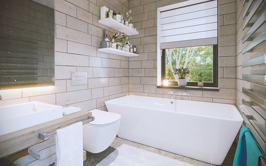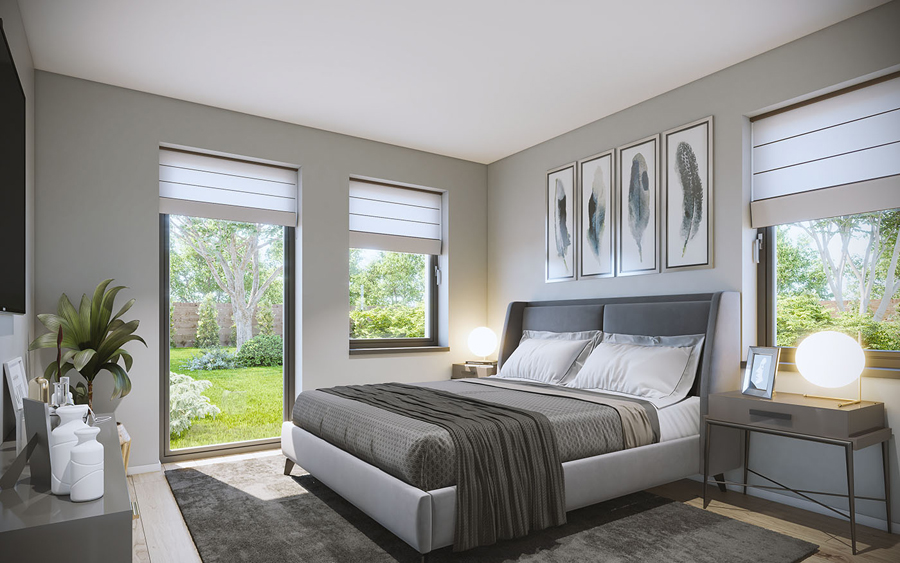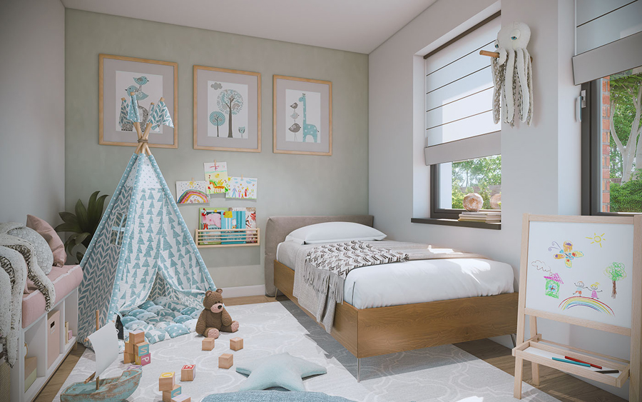 Przestronna łazienka pozwala na umieszczenie wanny z narożnikiem prysznicowym, umywalki oraz pralki z wystarczającą przestrzenią użytkową. W dwóch pokojach dziecięcych, do których wchodzi się z przedpokoju, przewidziano miejsce na pojemne szafy wnękowe.