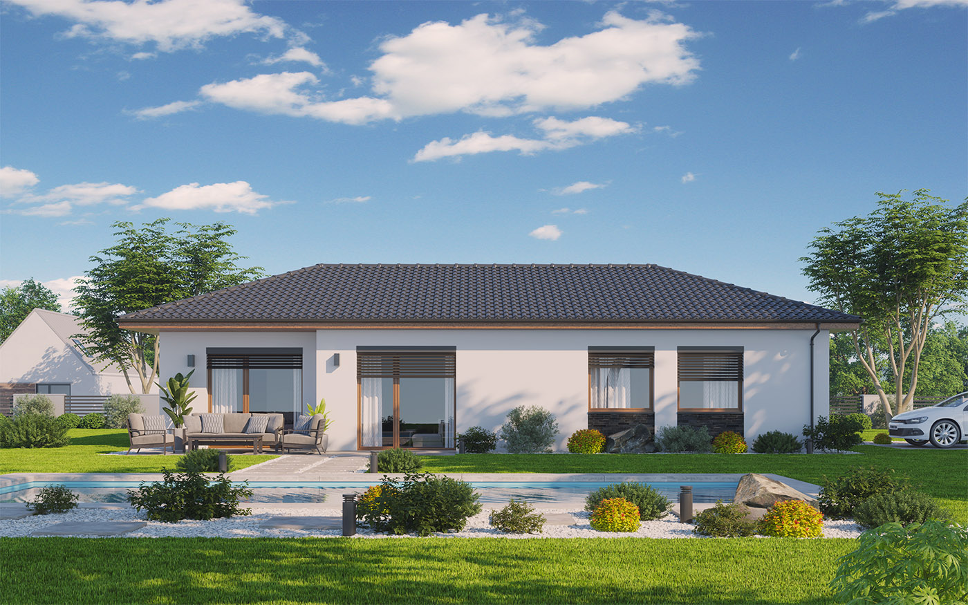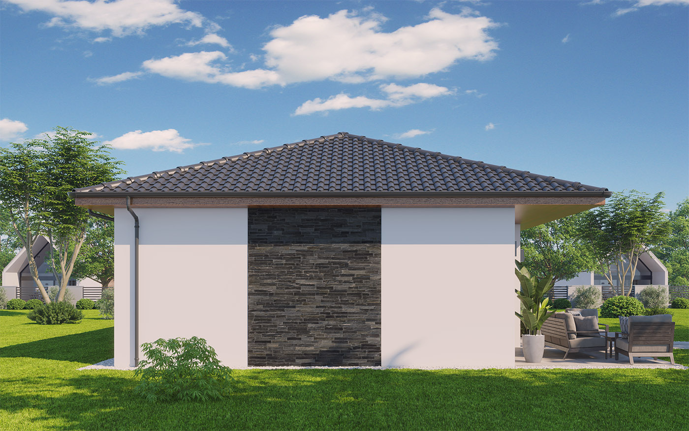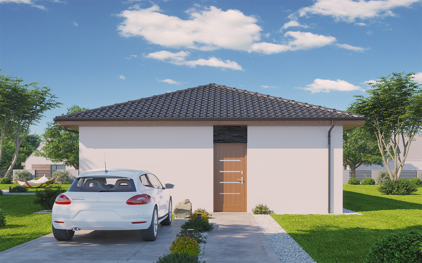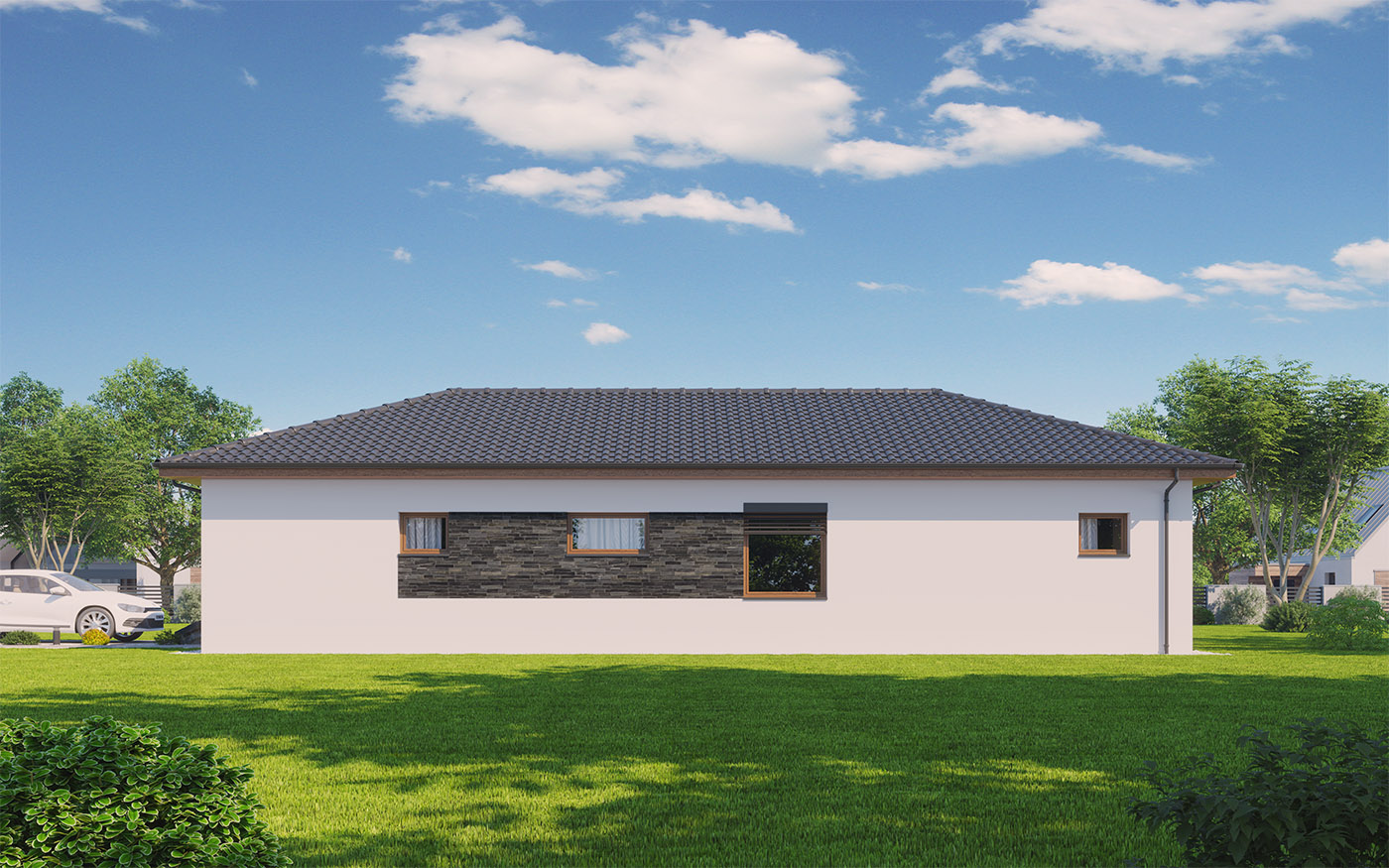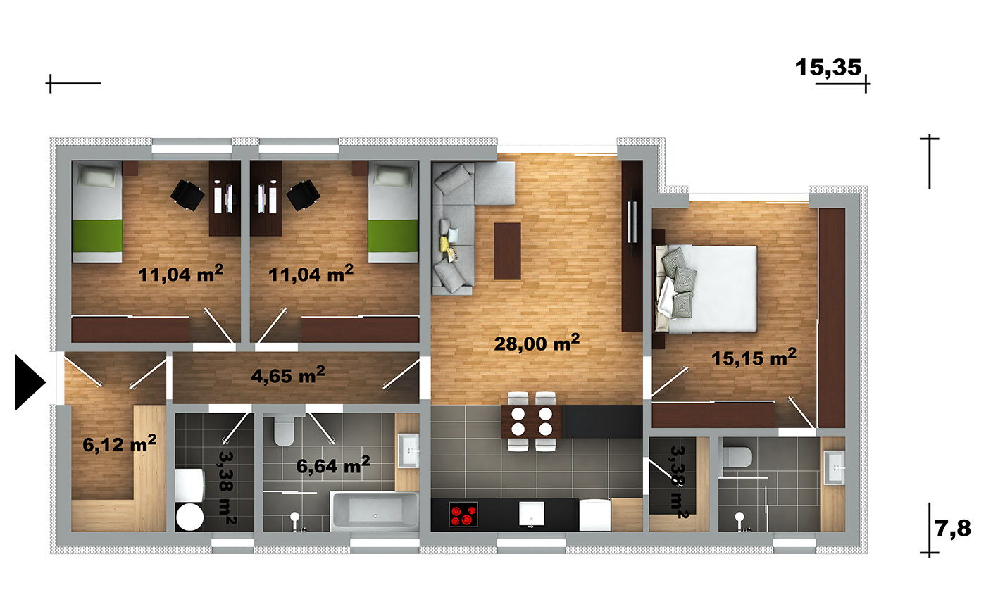 Dom parterowy o układzie pomieszczeń 4+kk o wymiarach 15,35x7,8 m.