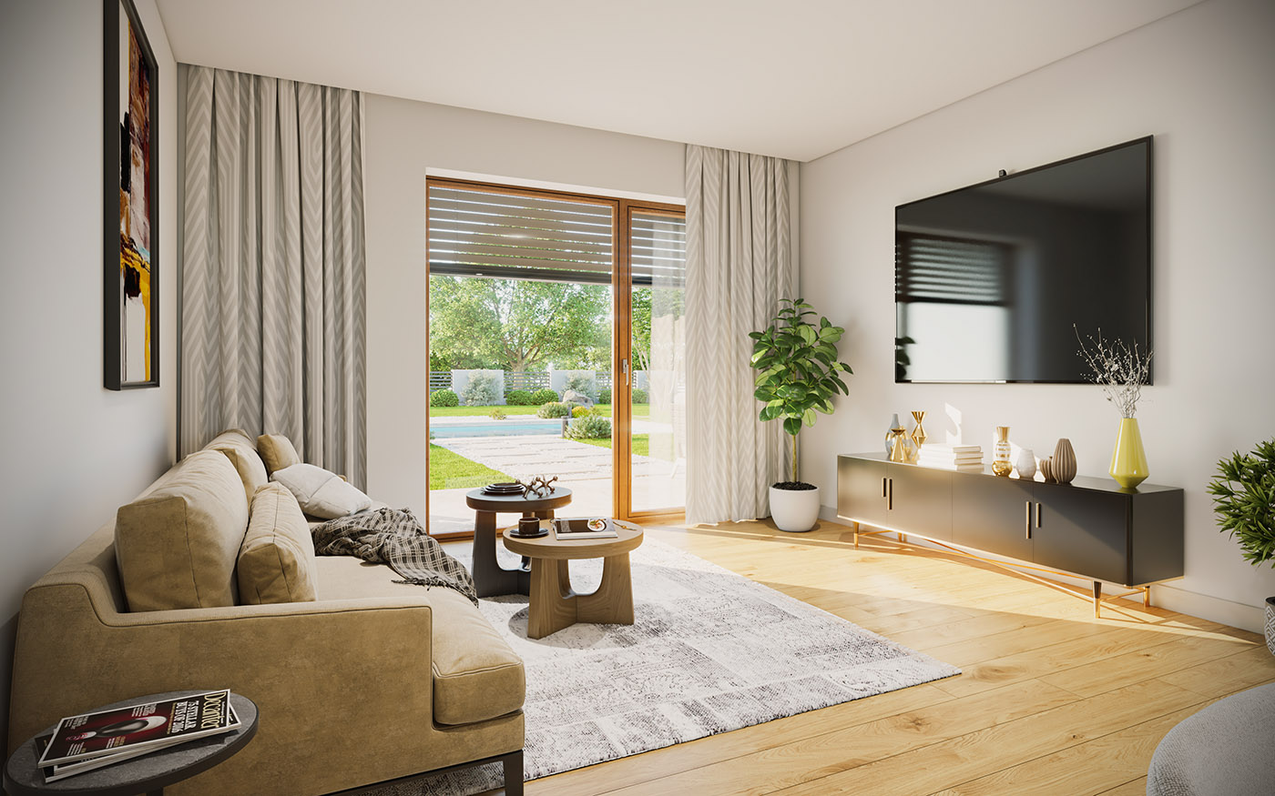 W salonie z aneksem kuchennym znajduje się duże francuskie okno w pobliżu sofy. Zawsze będziesz w kontakcie ze swoim ogrodem.