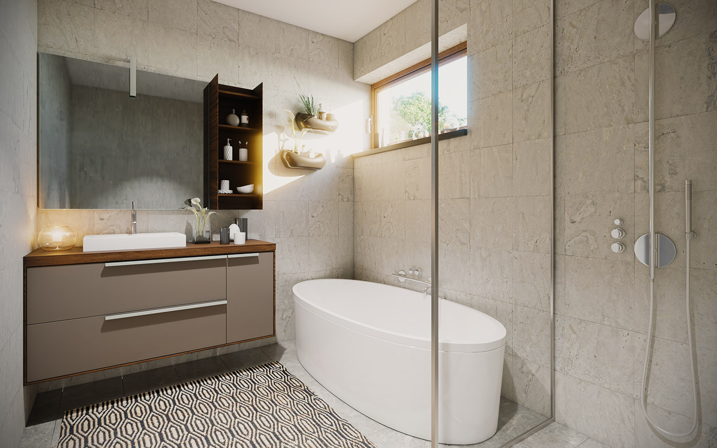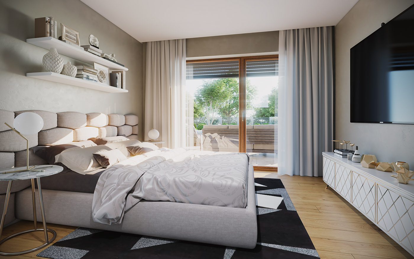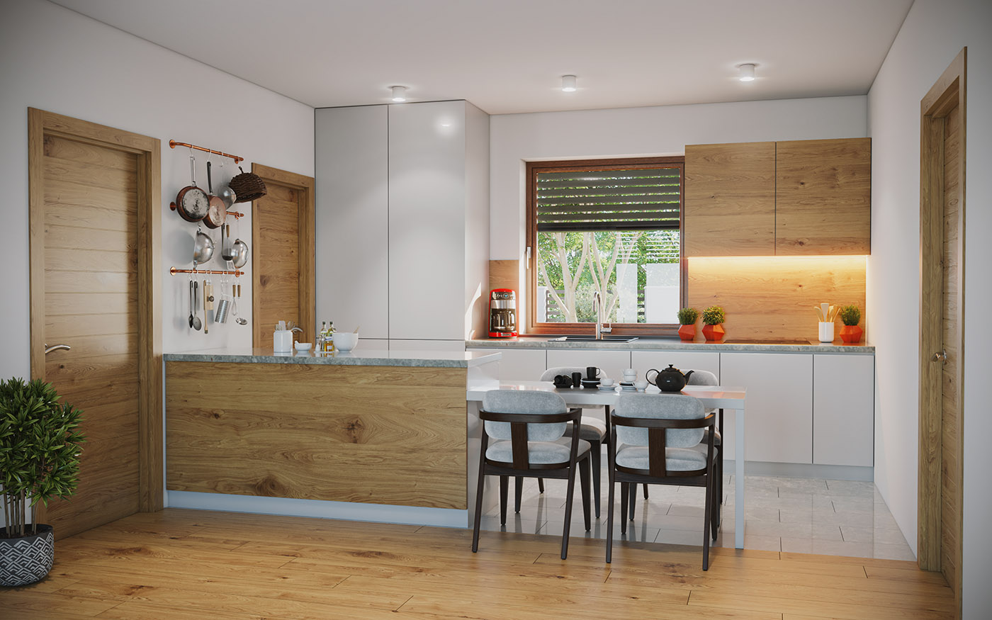 Przestronna kuchnia zawiera dużo miejsca do przechowywania rzeczy i oddzielną spiżarnię. Z salonu wchodzimy do sypialni, która dzięki położeniu za pokojem dziennym jest doskonale wyciszona od pokoi dziecięcych. Jedna łazienk z prysznicem, druga z wanną i prysznicem. W obu łazienkach zaprojektowano małe okna umożliwiające szybkie wietrzenie pomieszczenia.