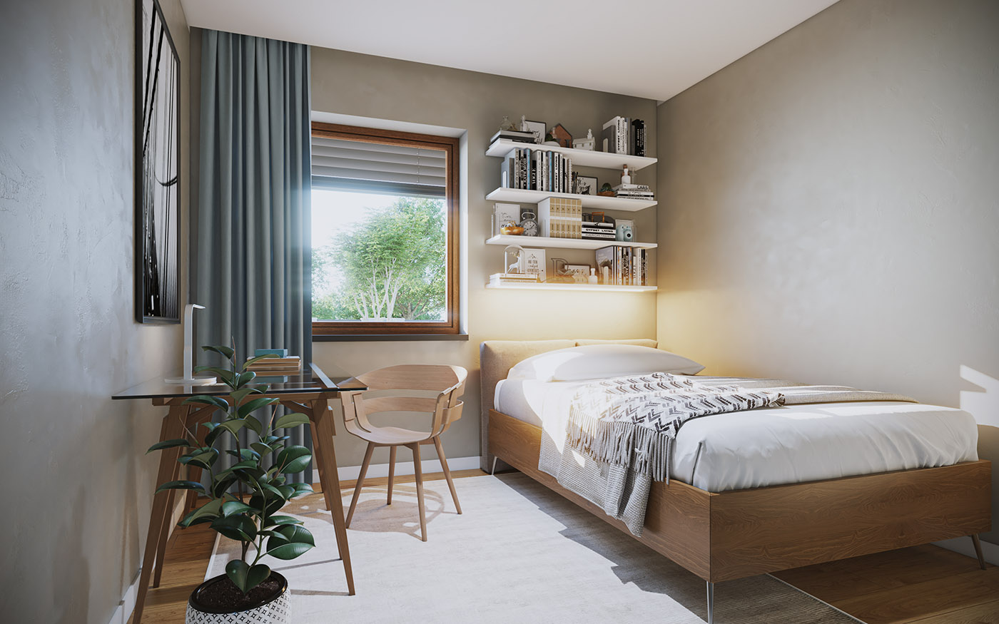 W przedsionku szafa przeznaczona jest do przechowywania płaszczy i butów. Znajdziemy tu również pomieszczenie techniczne. Dwa pokoje dziecięce dostępne z korytarza są identyczne pod względem wielkości.